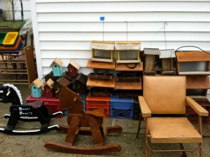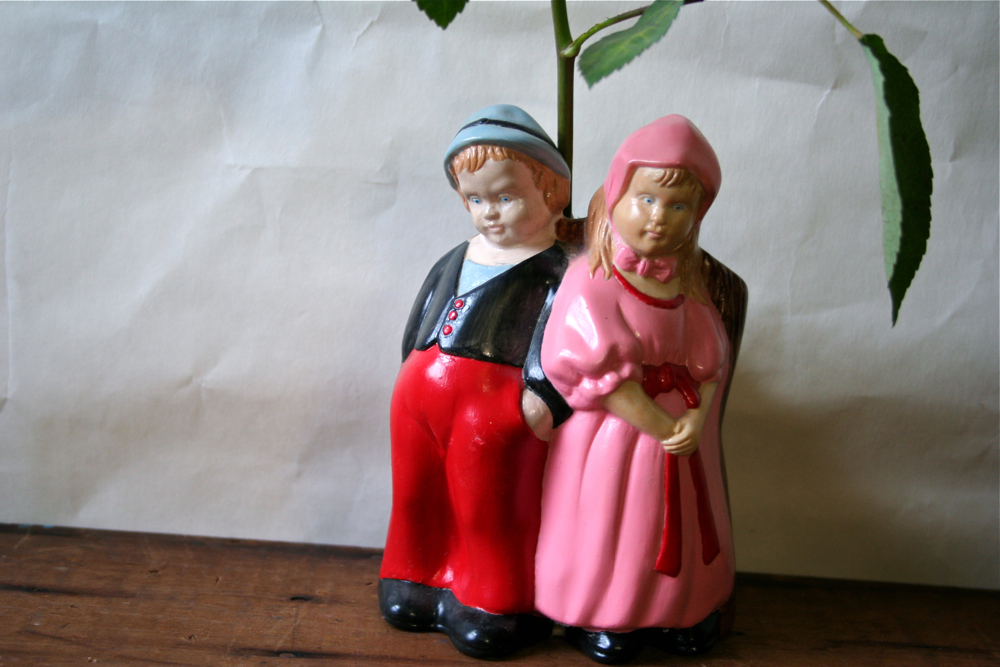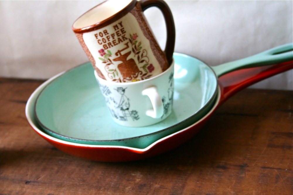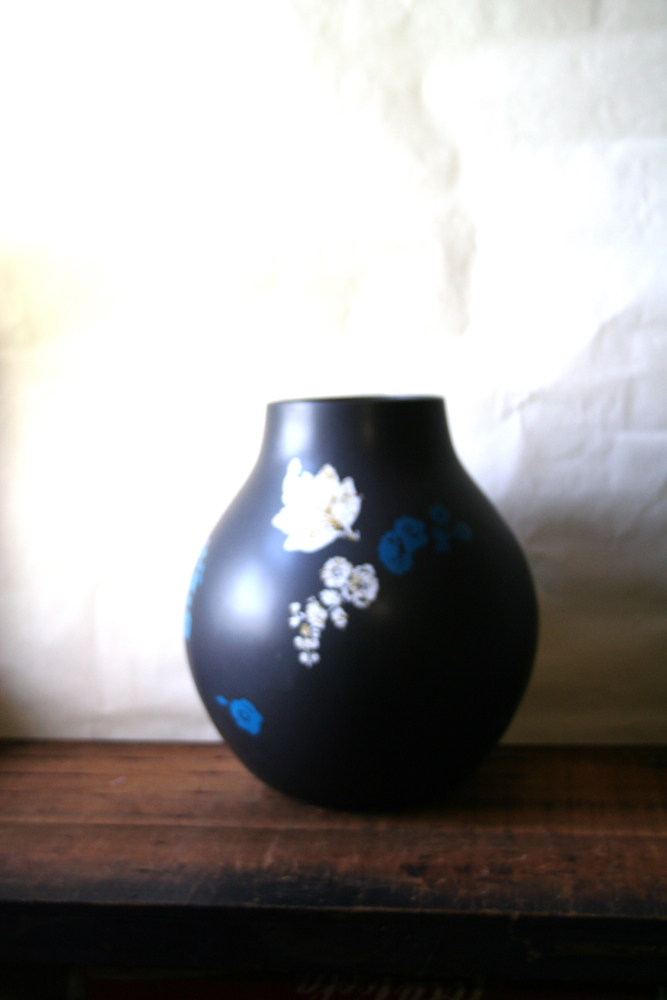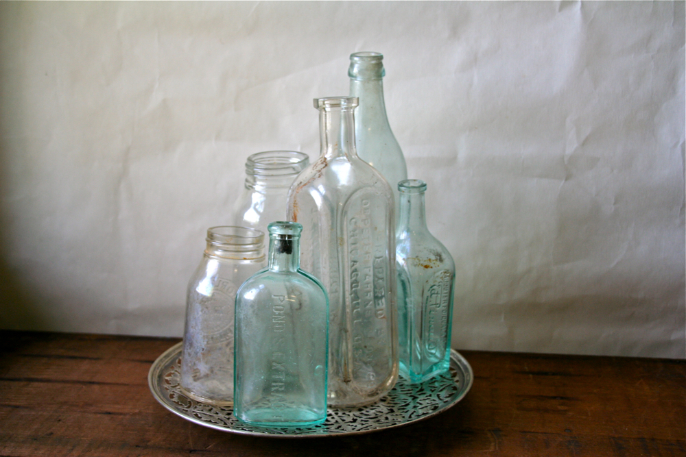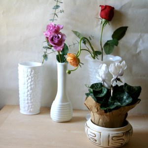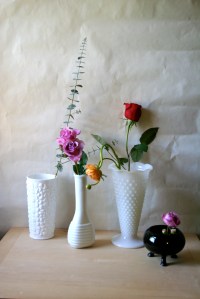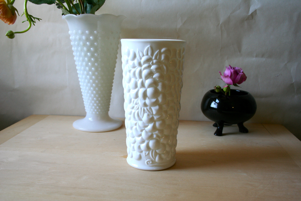 I found these white ones at a garage sale yesterday. The woman considered them a long time before charging me $1.00. The little black one is from my mother-in-law’s collection of amethyst and black glass. I think it is a candy dish.