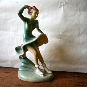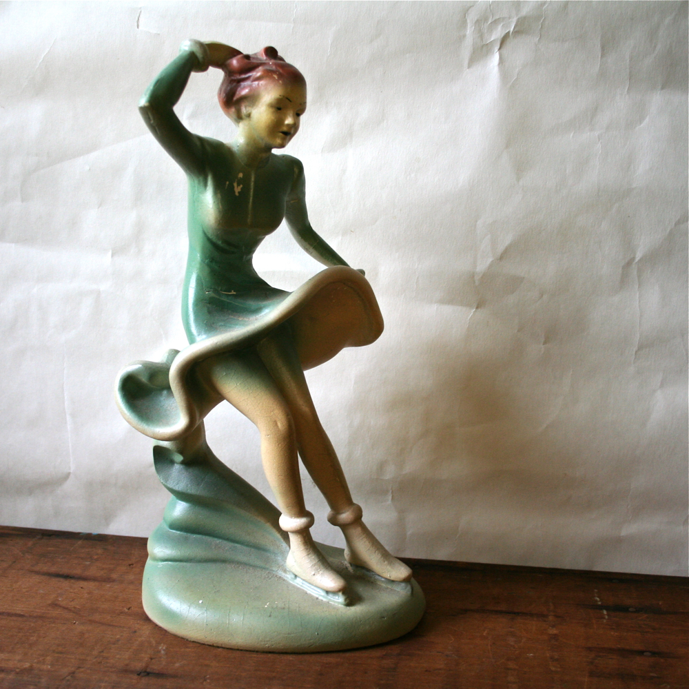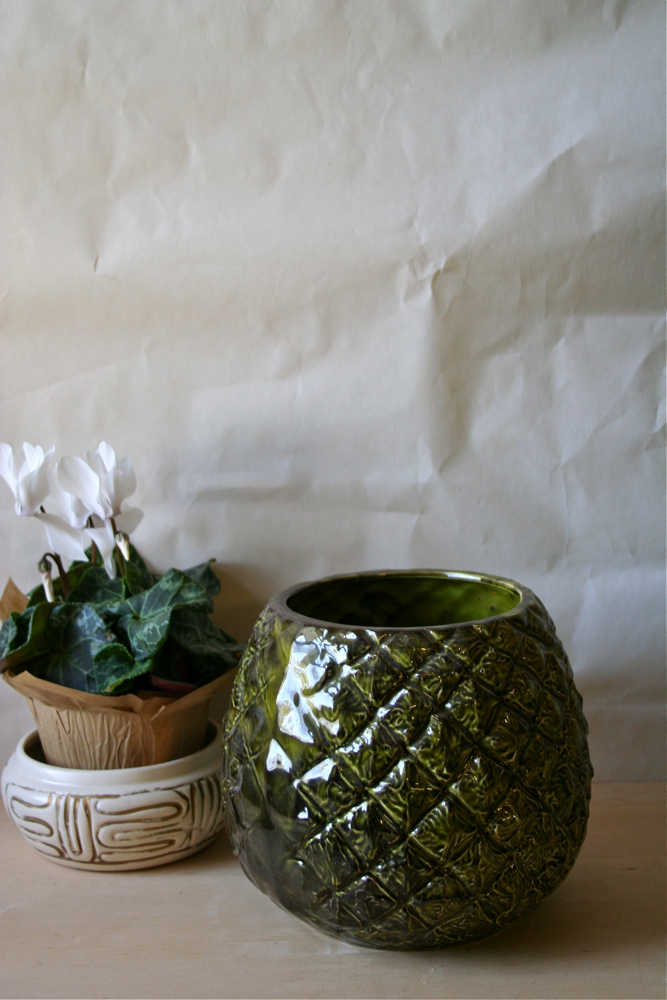 I like this handmade green planter with its pineapple angles and moody green glaze. A different garage sale.